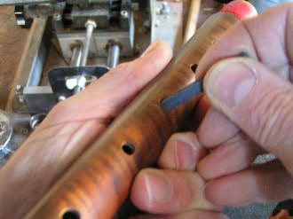 However, recorder makers usually use a narrow tuning knife, but this technique needs learning. A 3 mm double-bevelled blade is perfect for this. The top and bottom areas of the hole must be cut separately, beginning on one side and working around to the other, stopping before the blade gets parallel to the fibres, when it will start splitting the wood instead of cutting it. This circular movement is made easier with a round handle. |